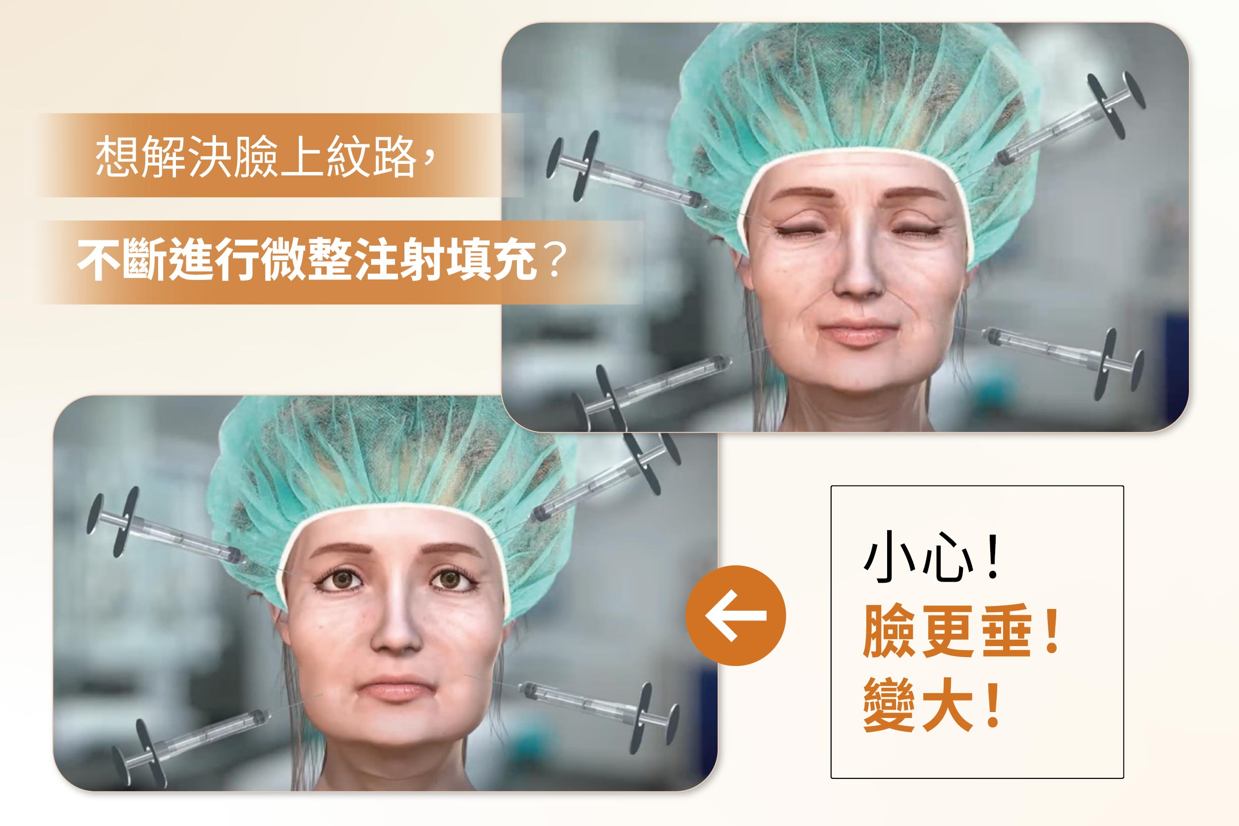 在這一定要特別提醒大家注意,若皮膚彈性還不差,下垂問題不嚴重是可以只針對紋路填補的,但若皮膚彈性不佳,合併下垂問題,若填補過多反而增加了下垂力量,且容易饅化,所以步驟應先上提後再做填補才能即年輕又精緻。