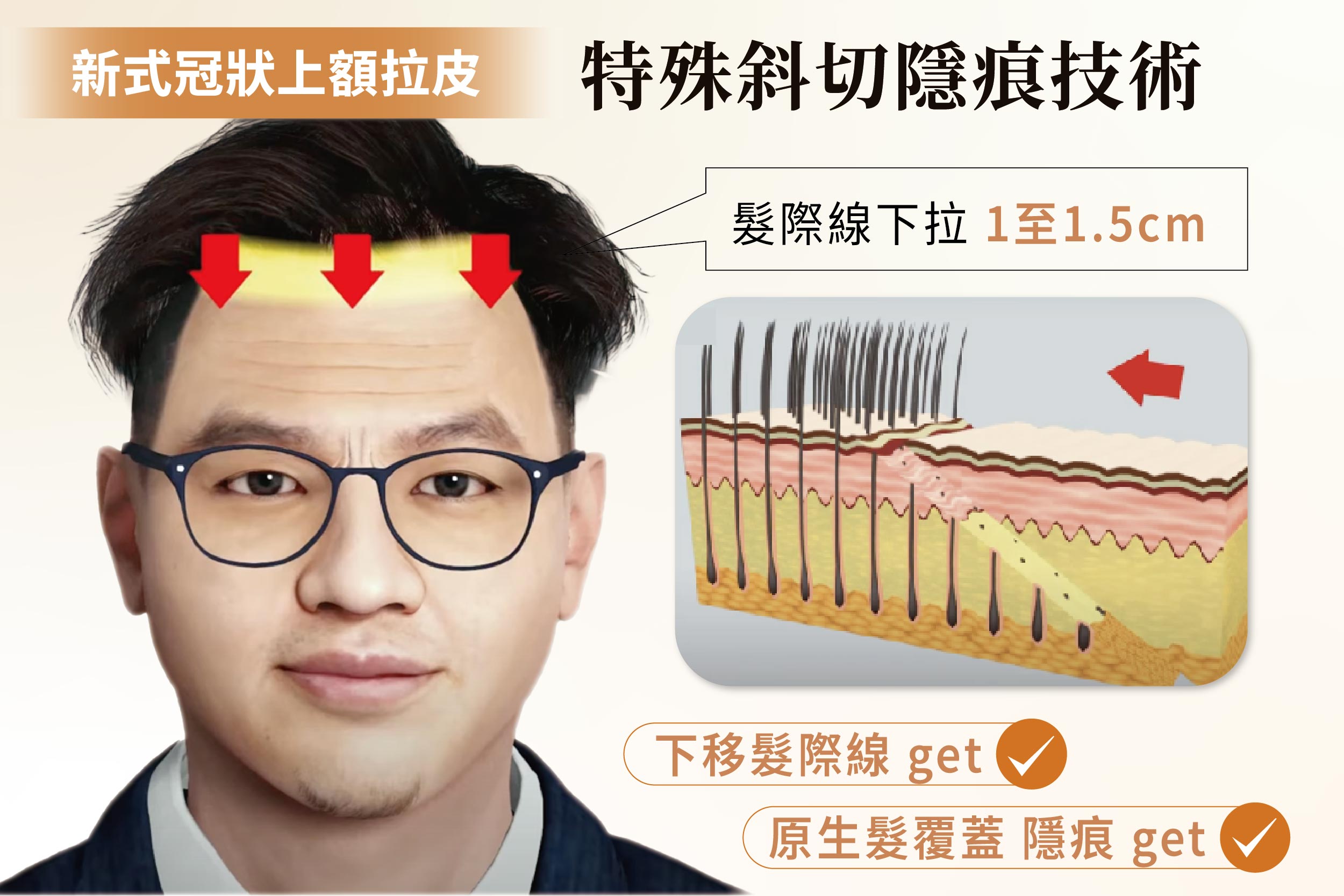 傷口隱形  傷口藏於髮際線內 傷口藏於髮際線內 採「特殊斜切技術」,不影響毛囊生長,達到真正隱痕效果
