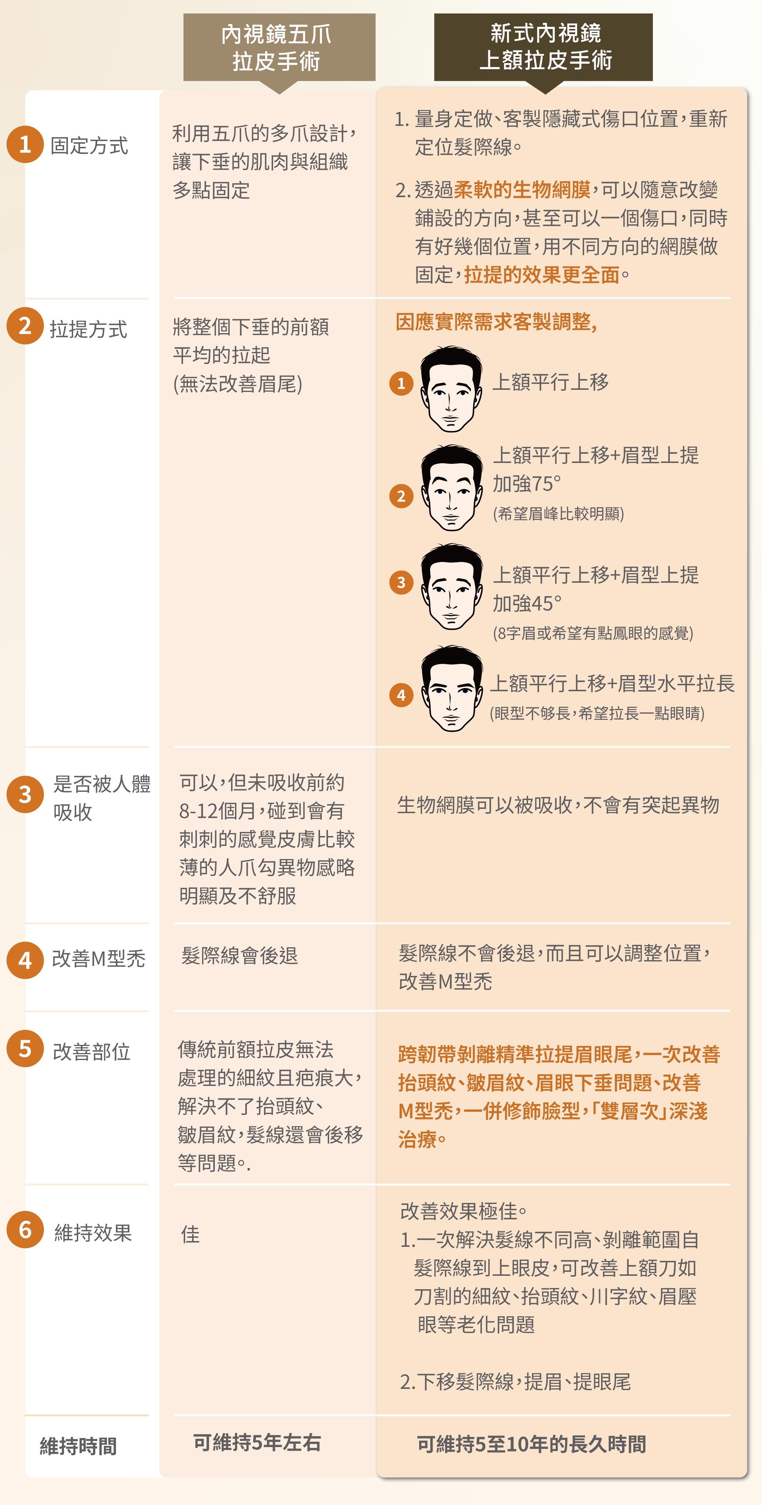 以下的簡單比較表(內視鏡五爪拉皮手術、新式內視鏡上額拉皮手術),可以讓大家更一目了然。