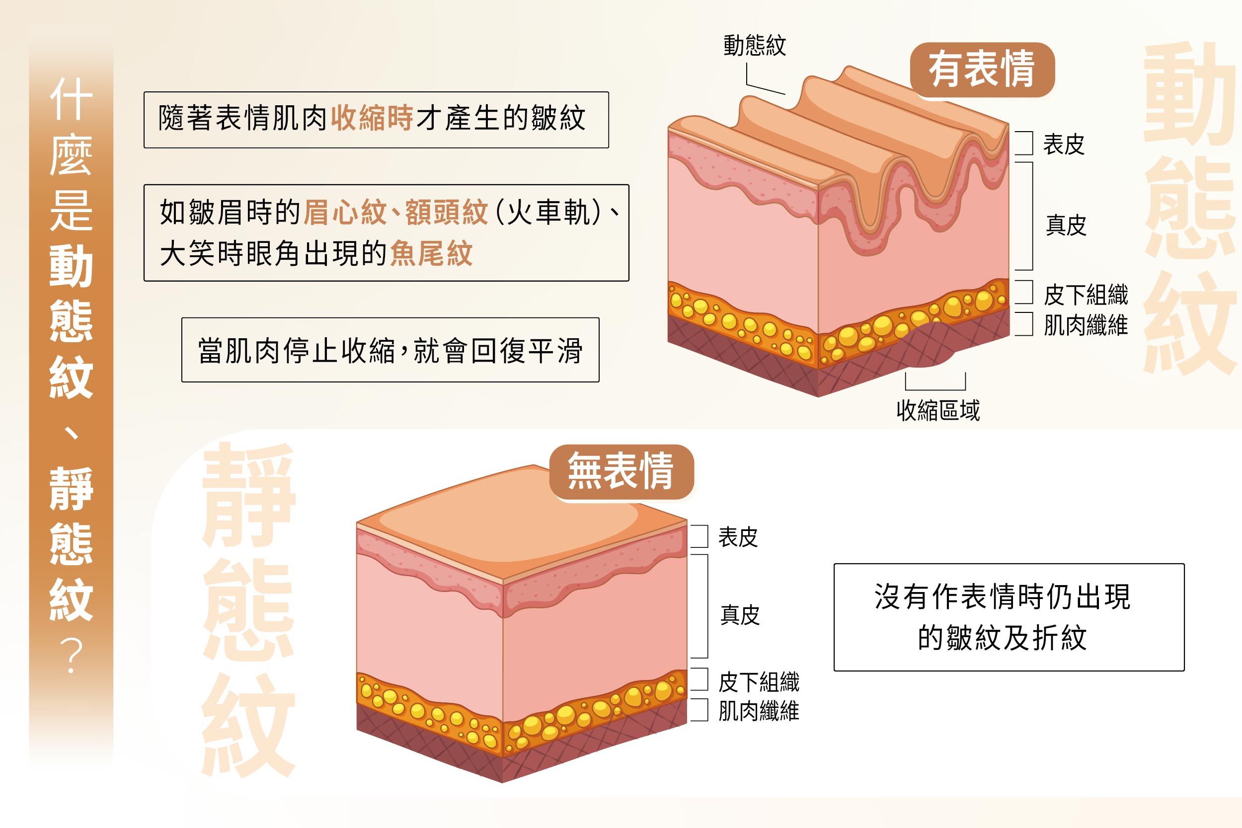 動態紋—表情動作形成的皺紋, 例如皺眉、挑眉時,因為肌肉收縮,拉扯、推擠臉部肌膚而形成的皺紋,就屬於動態紋。比方抬頭紋、皺紋紋、魚尾紋等表情紋,這可以肉毒放鬆肌肉攺善。